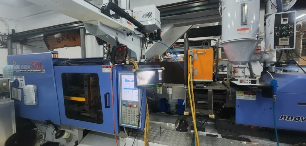 我們所有的射出機都配備了伺服驅動機械手臂。它不僅能24小時不知疲倦地進行成品取出,更重要的是,它確保了每一個成型週期的穩定性。固定的開模時間與取出節奏,避免了因人為操作快慢不一而導致的產品品質波動(如縮水、翹曲),是實現大規模、高品質量產的關鍵。